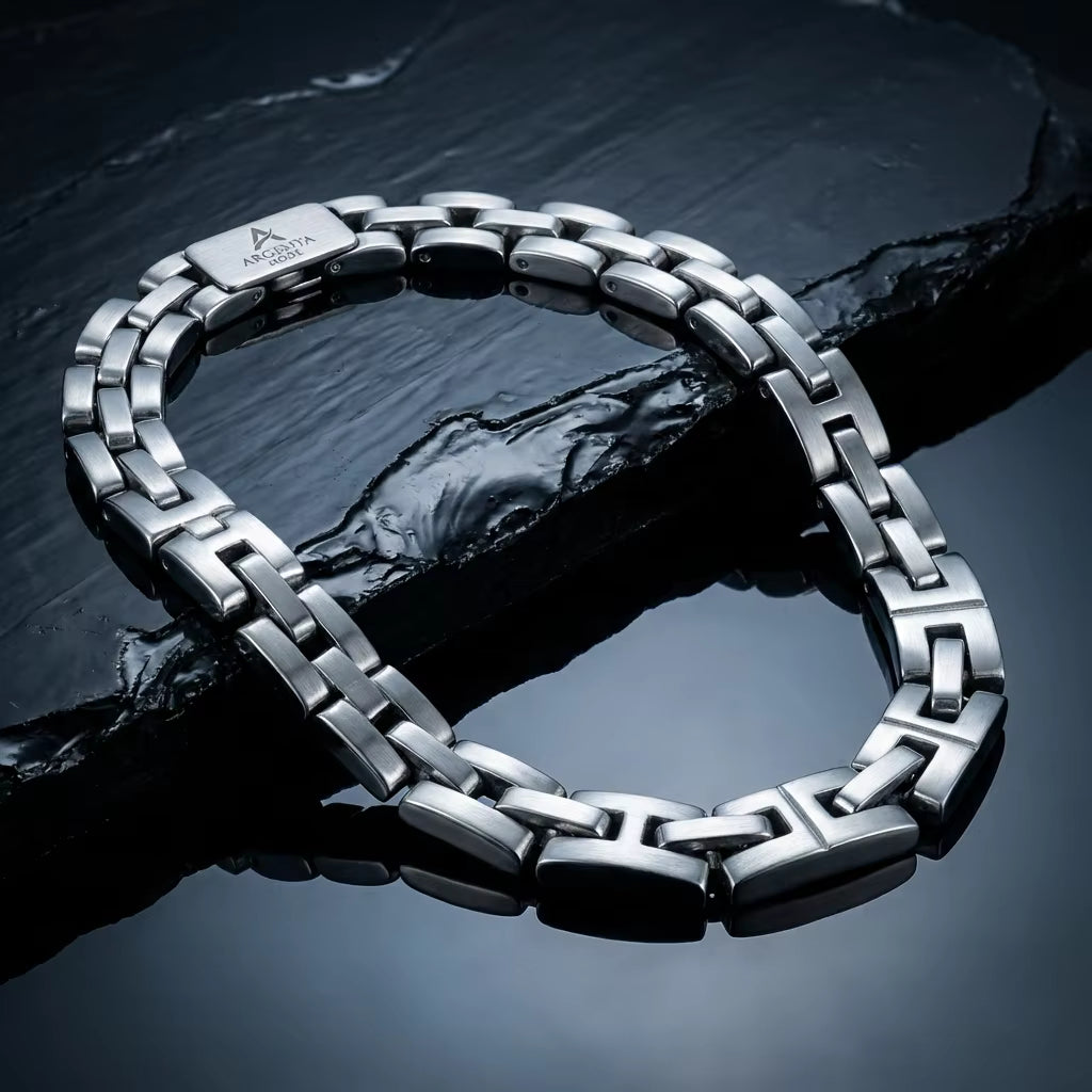 High-precision PVD coating delivers a platinum-level silver finish. Reflecting the brutalist beauty of the industrial world in every link.